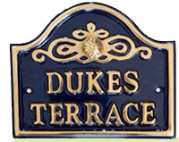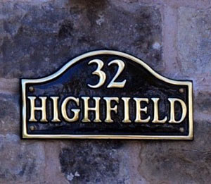 Cast Brass House Signs and Name Plates These plates are made of heavy solid brass with the backgrounds painted Black, Blue, Green or Maroon. The size of lettering, motif and numbers can be varied to create a sign with an overall balanced appearance. All items are pre drilled with fixing holes and screws are included. .Click here to order your Cast Brass House Nameplate Your Choices Background Colours - Black, Blue , Green, Maroon Motifs - We have a selection of standard motifs Sizes Arch Top B12: 30 x 25cm B13: 32.5 x 25cm B3: 37 x 19cm B16: 19 x 14cm max 7 letters per line Ovals B2: 33 x 25cm B8: 19 x 14cm With Motif as shown - max 7 letters per line (Rope border as standard unless specified) Rectangles B10: 30 x 18cm B11: 43 x 10cm single line B1: 30.5 x 6.5cm single line - max 12 letters Numbers B6: 14 x 10cm B7: 19 x 14cm (Rope border as standard unless specified) B4: 14 x 11.5cm B5: 11.5cm Email Us For A Quote