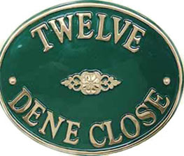 Cast Brass House Signs and Name Plates These plates are made of heavy solid brass with the backgrounds painted Black, Blue, Green or Maroon. The size of lettering, motif and numbers can be varied to create a sign with an overall balanced appearance. All items are pre drilled with fixing holes and screws are included. .Click here to order your Cast Brass House Nameplate Your Choices Background Colours - Black, Blue , Green, Maroon Motifs - We have a selection of standard motifs Sizes Arch Top B12: 30 x 25cm B13: 32.5 x 25cm B3: 37 x 19cm B16: 19 x 14cm max 7 letters per line Ovals B2: 33 x 25cm B8: 19 x 14cm With Motif as shown - max 7 letters per line (Rope border as standard unless specified) Rectangles B10: 30 x 18cm B11: 43 x 10cm single line B1: 30.5 x 6.5cm single line - max 12 letters Numbers B6: 14 x 10cm B7: 19 x 14cm (Rope border as standard unless specified) B4: 14 x 11.5cm B5: 11.5cm Email Us For A Quote