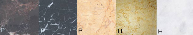 Marble is metamorphosed limestone and is a strong material with different sizes of crystal and colour variances. It is approx 10mm thick. We have three polished marbles and two with a natural smooth honed.