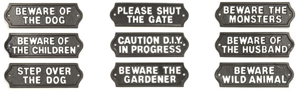 Cast Metal Signs and Gift Plaques These plaques are made from a heavy casting alloy which will not rust or corrode. Size. 7" x 2.25" Click here to order your Cast Metal Plaque Complete List BE KIND TO THE CAT BEWARE ANGRY CAT BEWARE OF THE CHILDREN BEWARE OF THE DOG BEWARE OF THE HUSBAND BEWARE THE ELDERLY BEWARE THE GARDENER BEWARE THE MONSTERS BEWARE WILD ANIMALS CAUTION D.I.Y. IN PROGRESS CAUTION MAN SLEEPING COME BACK TOMORROW DONT EXCITE THE WIFE DON'T WAKE THE DOG PLEASE SHUT THE GATE SPIDERS KEEP OUT STEP OVER THE DOG THE CAT IS IRRATIONAL TOILET GENTS LADIES PRIVATE MIND THE STEP NO PARKING WE LOVE THE NEIGHBOURS THE CHILDREN ARE TAME THIS IS NOT A HOTEL Sizes and Prices One Size - 7" x 2.25" Email Us For A Quote Order 2 or more signs for a £5 discount Click here to place your order